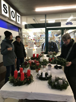 Am Samstagmorgen vor der Brockenstube freuten sich die treuen Kundinnen und Kunden, wieder einen frischen Adventskranz oder ein hübsches Kerzengesteck zu kaufen. Bereits am wöchentlichen Freitagsmarkt waren sehr viele Werke verkauft worden. Der Erlös wird dem Fonds „Mutter und Kind“ vom Thurg. Gemeinnützigen Frauenverein TGF gespendet.